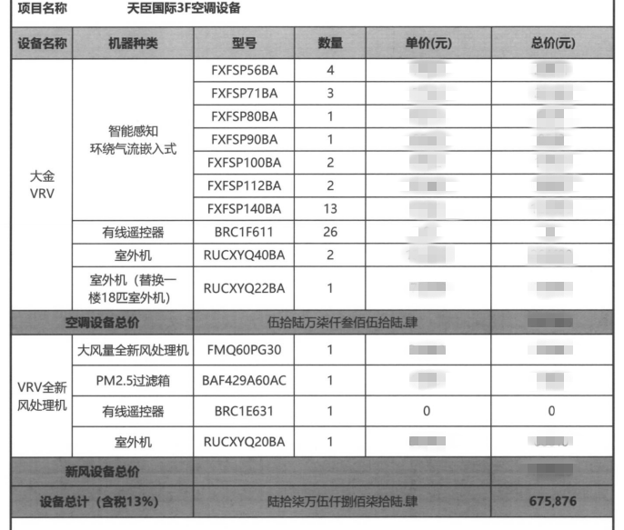 項目內容:大金空調 SkyAir Multi系列  VRV-D VRV-X7系列中央空調  VRV X新風處理機全新風集控系統安裝項目
