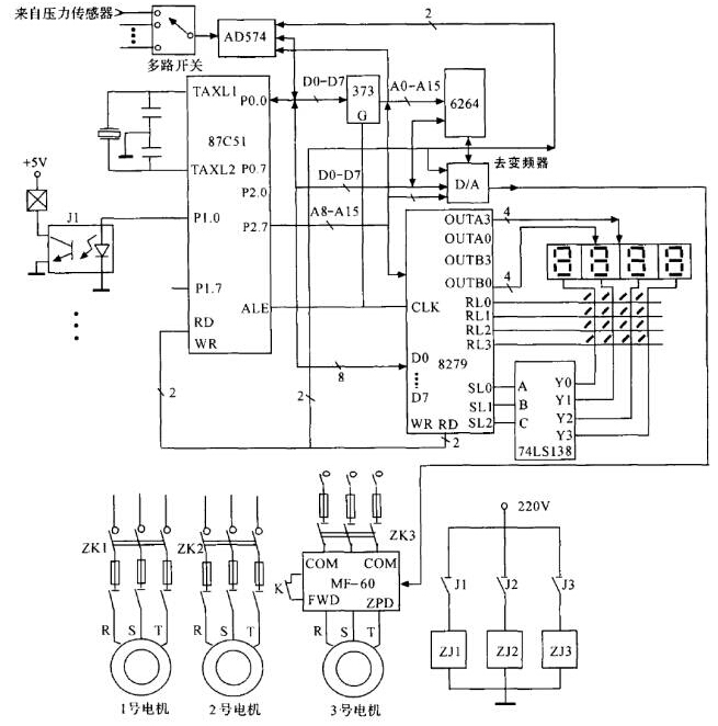控制器主要實現對送風量的控制,使送風壓力保持基本恒定。這里用單片機及其外圍電路構成,如圖4所示。用數碼管顯示送風壓力,壓力的給定可以用鍵盤輸入也可以用電位器經A/ D轉換后輸入。控制器在功能上,既能實現連續控制,也能實現分級不連續控制,具體通過程序編制實現。